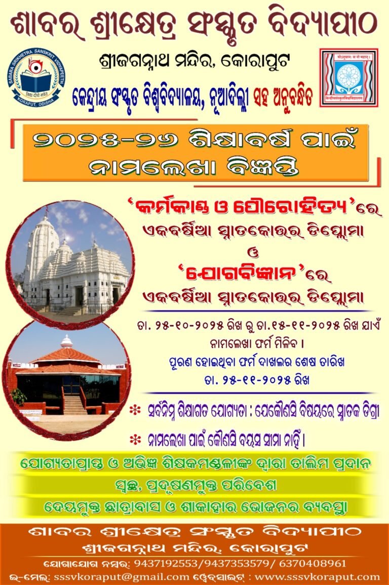 Sabara Srikhetra Sanskrit Vidyapeeth in Koraput has received recognition and affiliation from Central Sanskrit University, New Delhi